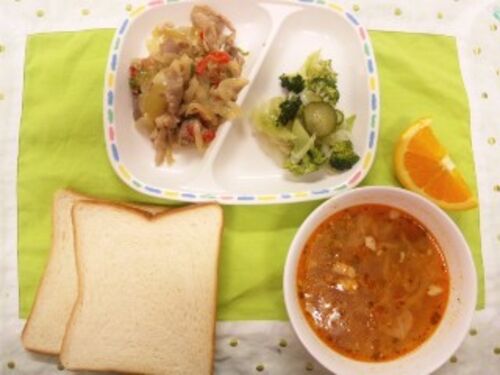 メニュー 食パン・ジャム ミネストローネ 豚肉とキャベツのカレー炒め グリーンサラダ オレンジ 今日はパンの日でした。 さいきんパンの日を1か月に2回に減らしましたが・・・ 子どもはパンが好きですね!ミネストローネには、キャベツ・たまねぎ・べーこ…